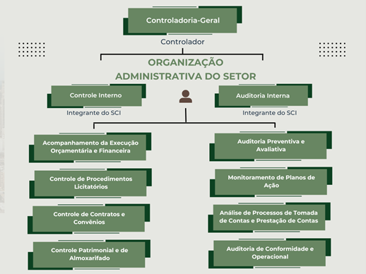 Estrutura funcional da Controladoria-Geral da Câmara Municipal, composta pelo Controlador, Controle Interno e Auditoria Interna — ambos integrantes do Sistema de Controle Interno (SCI). Atribuições incluem acompanhamento orçamentário, controle de licitações, contratos, patrimônio, auditorias preventivas e operacionais, e análise de prestações de contas.
